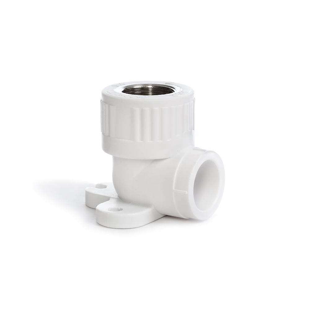 Угольник комбинированный из полипропилена с внутренней резьбой из латуни и настенным креплением с одной стороны имеет раструбное термофузионное соединение под полипропиленовую трубу, а с другой стороны фитинга находится внутреннее резьбовое соединение.